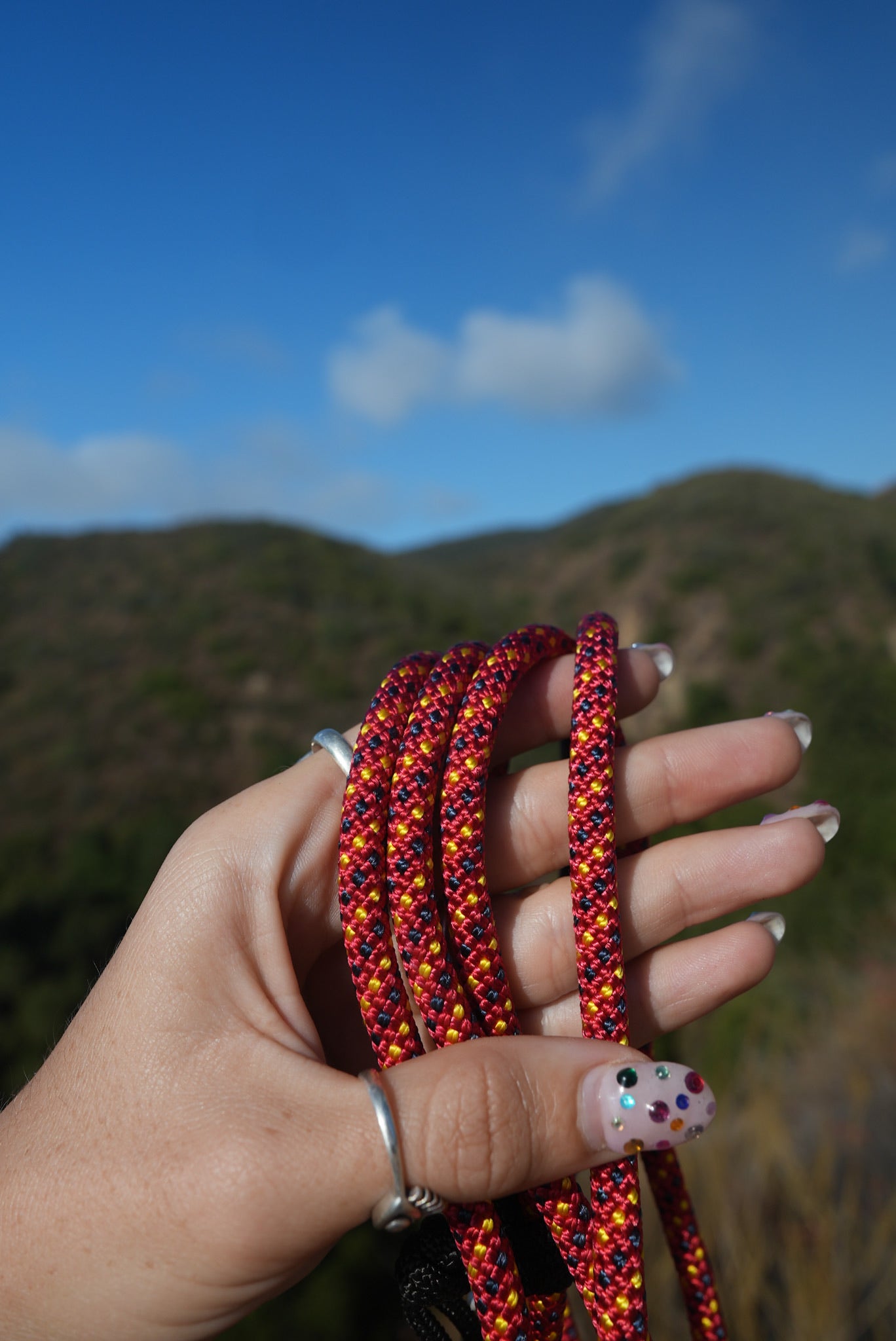 This 10 ft leash is our most popular item and for good reason. It's the perfect length to act as a 6 ft leash when you use it with our hands-free crossbody option or can quickly be used as a long line when fully extended. It has a snap in the handle to allow hands free walks or to use with a prong collar. Whether you've got a puppy or an adult dog, this lead is perfect for any dog, at any age. All of our leashes are made from recycled climbing rope and constructed here in the USA.